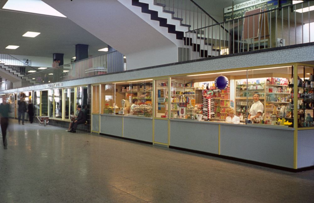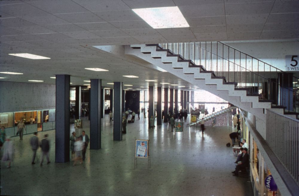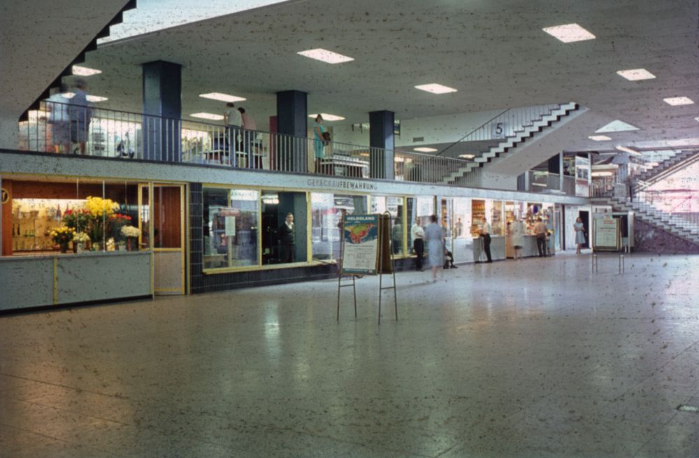 Blick in die Empfangshalle mit den dort vorhandenen Geschäften. Über diesen befand sich eine zweite Ebene, von wo aus man Zugang zu den Gleisen hatte.
