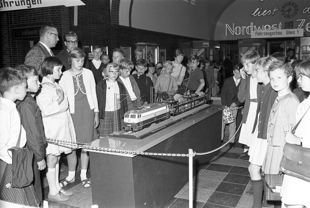 Im Bahnhofsgebäude gab es die bekannten Modelle zu sehen, die hier vermutlich von einer Schulklasse begutachtet wurden. Die teilweise doch etwas gelangweilten Gesichter lassen vermuten, dass für den Fotografen ein wenig „arrangiert“ wurde. Das Schild im Hintergrund „Fahrzeugschau Gleis 1“ weist aber den Weg zu den interessanteren Ausstellungsstücken.